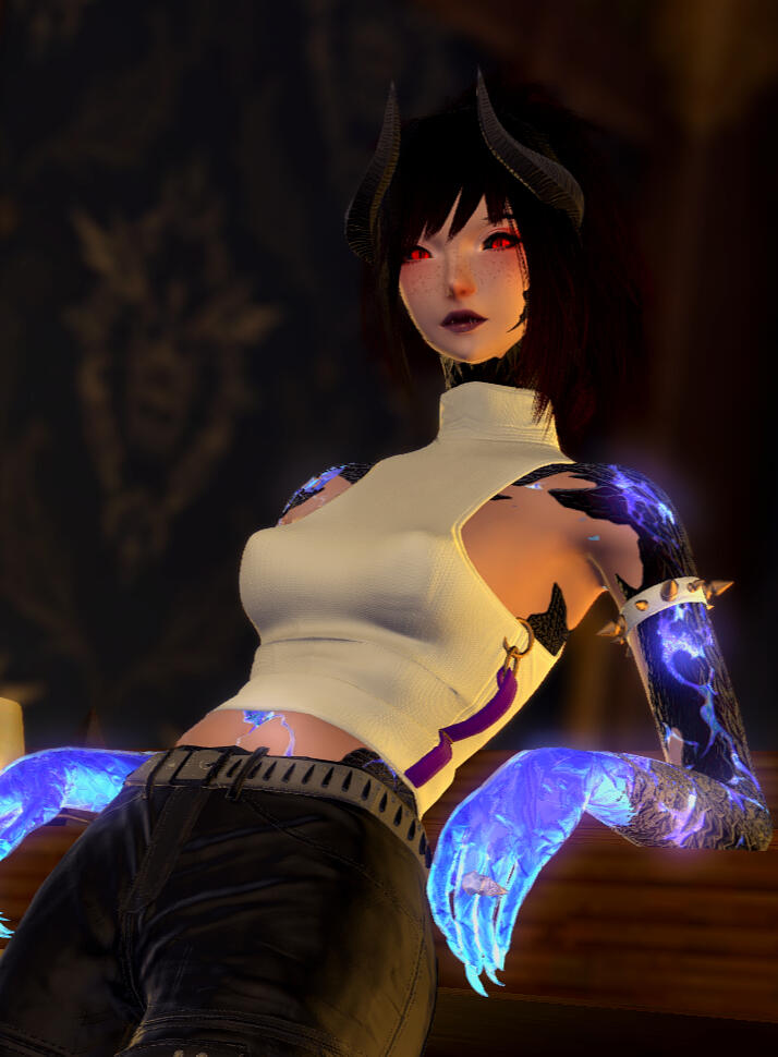 Runs a bakery in the goblet, Spends most of her time there or out gatheringAlways wears a face mask, covering the entirety of her neck and most of her face - up past the tip of her noseAlways has a Black collar wrapped around her neck over the mask, Pulsating red lines can be seen along it's surface, clearly Allagan tech